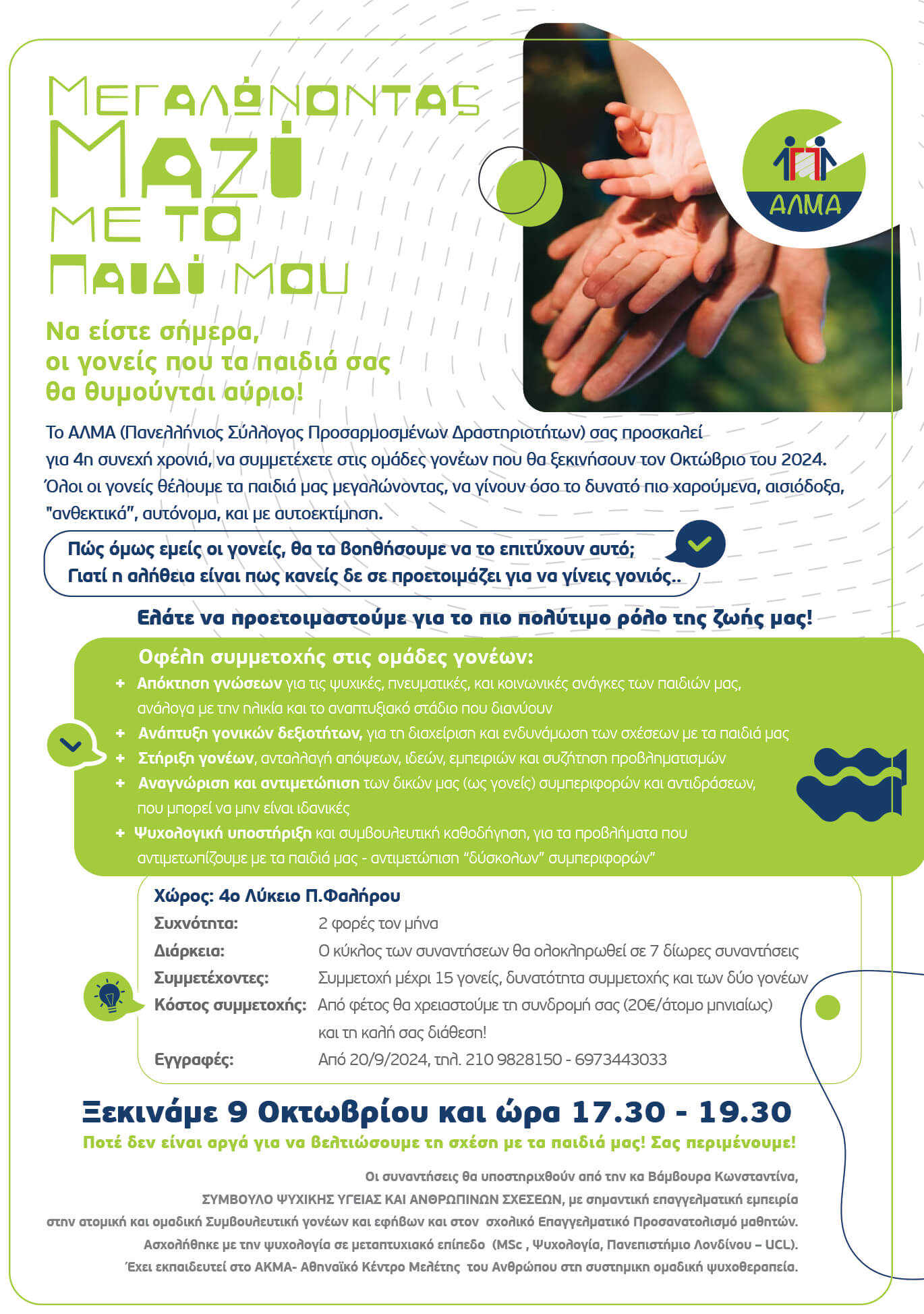 Το ΑΛΜΑ σας προσκαλεί για 4η συνεχή χρονιά, να συμμετέχετε στις ομάδες γονέων που θα ξεκινήσουν στις 9 Οκτωβρίου.
