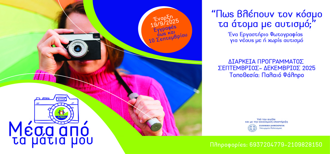 Υπό την αιγίδα και με την οικονομική υποστήριξη του Υπουργείο Πολιτισμού, το ΑΛΜΑ / ALMA υλοποιεί το έργο «Μέσα από τα μάτια μου» το οποίο είναι μια καλλιτεχνική δράση φωτογραφίας για νέες και νέους με αυτισμό και διάχυτες αναπτυξιακές διαταραχές ή χωρίς, ηλικίας 18 έως 30 ετών.