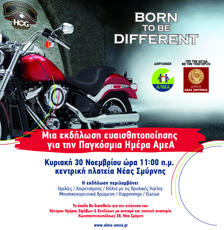 Ενόψει της Παγκόσμιας Ημέρας Ατόμων με Αναπηρία, το ΑΛΜΑ, Πανελλήνιος Σύλλογος Προσαρμοσμένων Δραστηριοτήτων για άτομα με αυτισμό και/ή με νοητική αναπηρία, διοργανώνει μια εκδήλωση ευαισθητοποίησης με τίτλο “Born to be different”, την Κυριακή 30 Νοεμβρίου και ώρα 11.00, με τη συνεργασία του Harley Owners Group, υπό την αιγίδα και με την οικονομική υποστήριξη του Δήμου Νέας Σμύρνης.