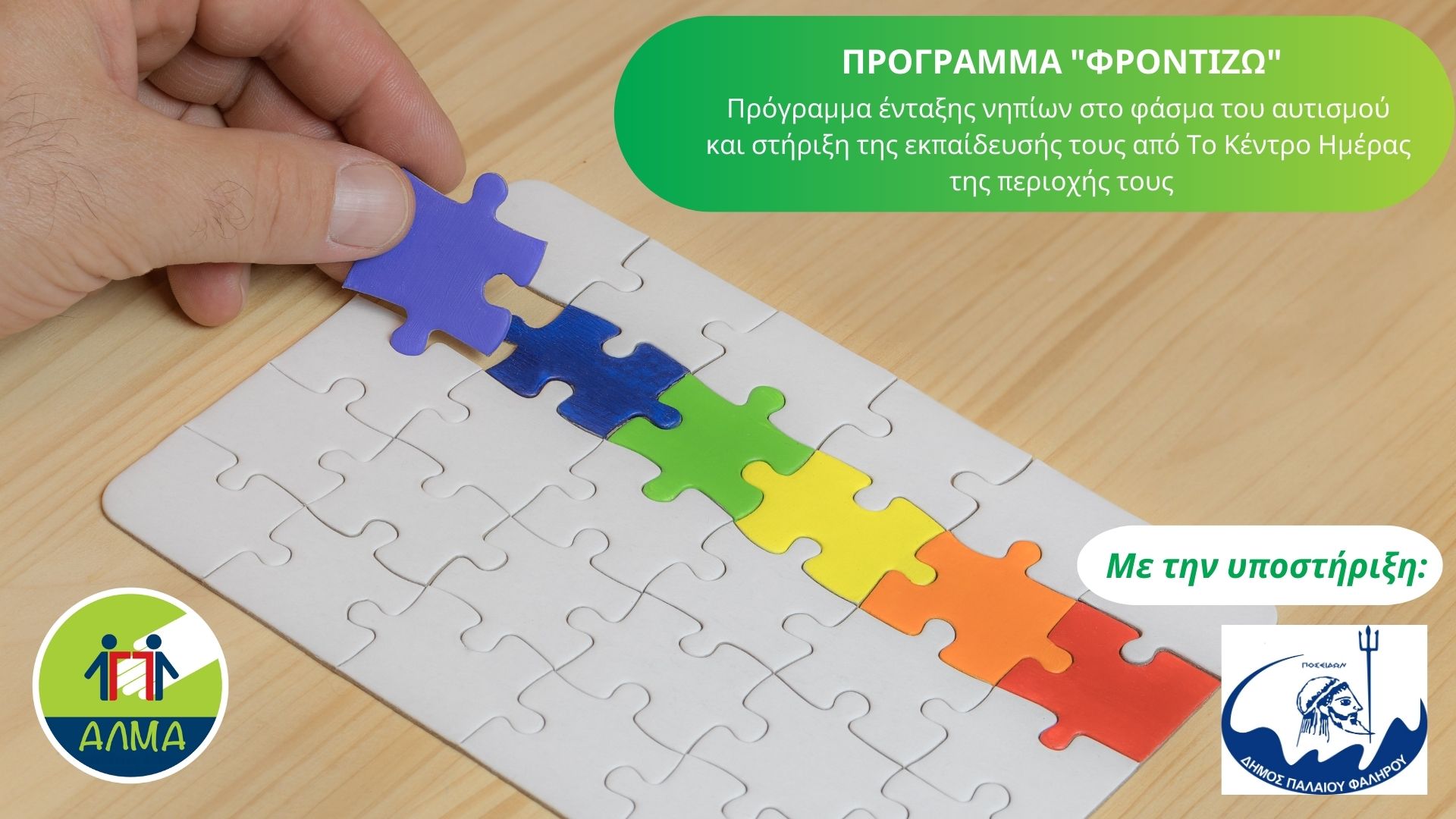 Το πρόγραμμα «ΦροντίΖΩ» είναι ένα πρωτοποριακό, πιλοτικό πρόγραμμα, σχεδιασμένο από το ΑΛΜΑ με τεχνογνωσία και αγάπη, το οποίο στοχεύει στην υποστήριξη των νηπίων με ΔΑΦ (Διαταραχές Αυτιστικού Φάσματος) στον παιδικό σταθμό της γειτονιάς τους.