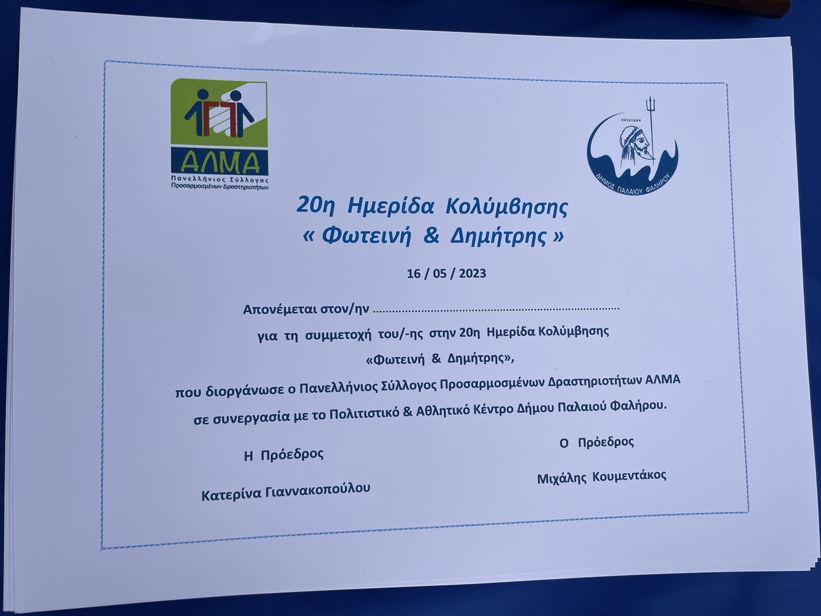 «Για τη Φωτεινή και το Δημήτρη» πραγματοποιήθηκε τη Τρίτη 16 Μαΐου 2023 η 20η Ημερίδα Κολύμβησης, στο ανοικτό Κολυμβητήριο του Πολιτιστικού και Αθλητικού Κέντρου Π. Φαλήρου. Η Φωτεινή και ο Δημήτρης, δύο αθλητές μας οι οποίοι δε βρίσκονται πια κοντά μας, είναι ο λόγος που συναντιόμαστε όλοι κάθε χρόνο σε αυτή τη γιορτή της θέλησης και του αθλητισμού. Προς τιμήν τους συμμετέχουν παιδιά και νέοι, με και χωρίς αναπηρία, δίνοντας το καλύτερό τους εαυτό, και κερδίζοντας ο καθένας το δικό του προσωπικό στοίχημα!