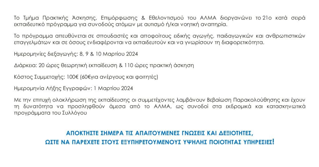Δευτέρα, 5 Φεβρουαρίου 2024 / Τα Νέα μας, Επιμόρφωση 21ο Εκπαιδευτικό Σεμινάριο Συνοδών Υποστήριξης Ατόμων με Αναπηρία Κοπή Πρωτοχρονιάτικης Πίτας 2024 – Δελτίο Τύπου 2 Απριλίου- Παγκόσμια Ημέρα Ευαισθητοποίησης για τον Αυτισμό Print 8 Rate this article: 5.0 Documents to download ΑΝΑΛΥΤΙΚΟΣ ΟΔΗΓΟΣ ΕΚΠΑΙΔΕΥΣΗΣ(.pdf, 1,31 MB) - 4 download(s)