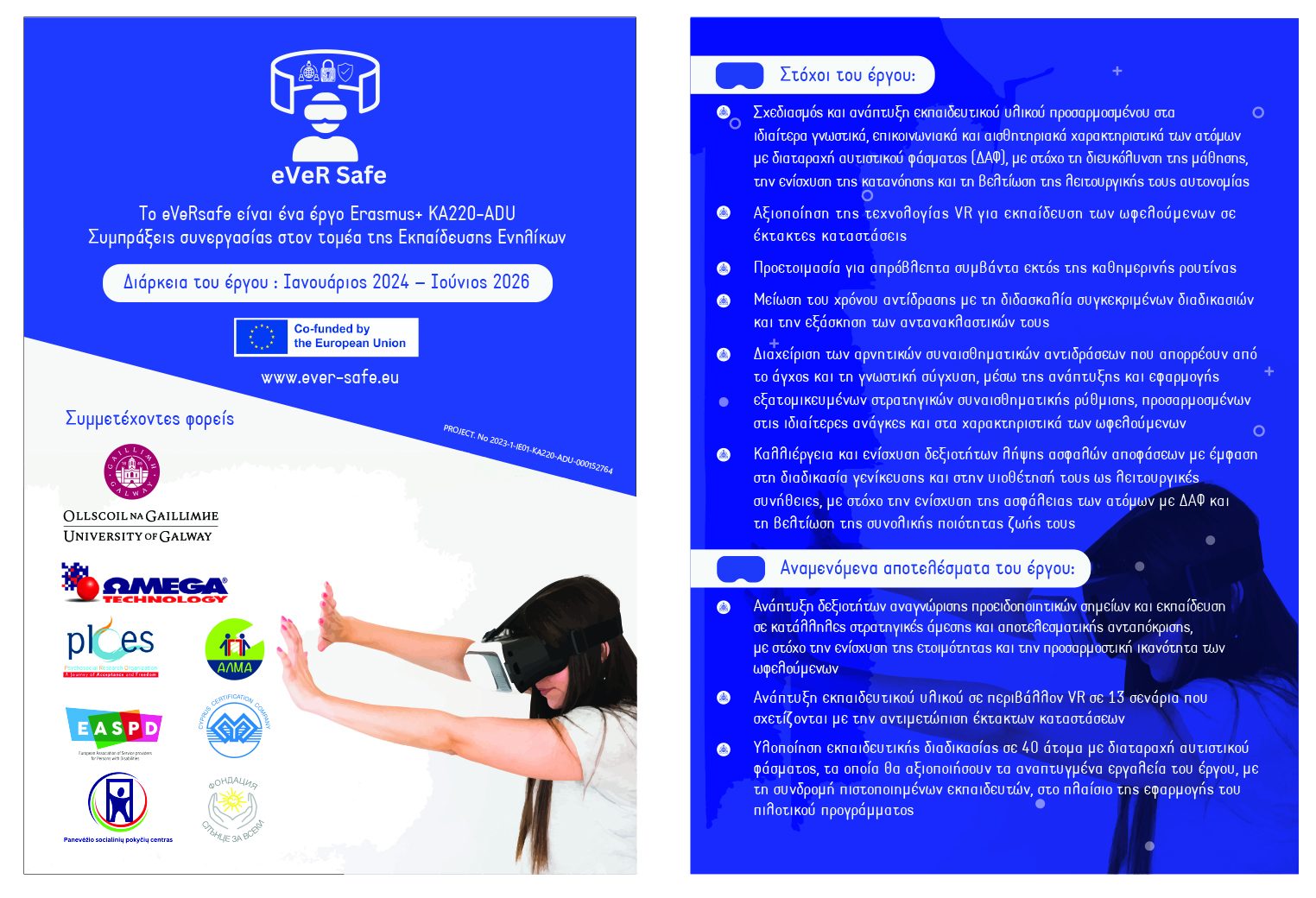 Το eVerSafe στοχεύει στην αξιοποίηση της τεχνολογίας VR για την εκπαίδευση ατόμων με αυτισμό με σκοπό την αντιμετώπιση έκτακτων καταστάσεων. Στο eVeRsafe συμμετέχουν 8 εταίροι από 6 ευρωπαϊκές χώρες, Ελλάδα, Κύπρο, Ιρλανδία, Λιθουανία, Βουλγαρία και Βέλγιο. Από την Ελλάδα, συνυπογράφουν το ΑΛΜΑ, η Εταιρεία Ψυχοκοινωνικών Μελετών (Ε.ΨΥ.ΜΕ.) και η OmegaTechnology.